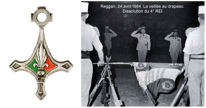 Reggan, 24. und 25. April 1964. In Anwesenheit von General Lefort, Inspekteur der Legion, General Spitzer, ehemaliger Kommandeur des 1. Fremdenkavallerieregiments (1er REC), sowie der Obersten Caillaud, Kommandeur des 2. Fremdenfallschirmjägerregiments (2nd REP), Le Vert, Kommandeur des 2. Fremdeninfanterieregiments (2nd REI), und de Broissia, Kommandeur des 1. Fremdenkavallerieregiments (1er REC), fand die Auflösungszeremonie des 4. Fremdeninfanterieregiments unter Oberst Brulé statt.