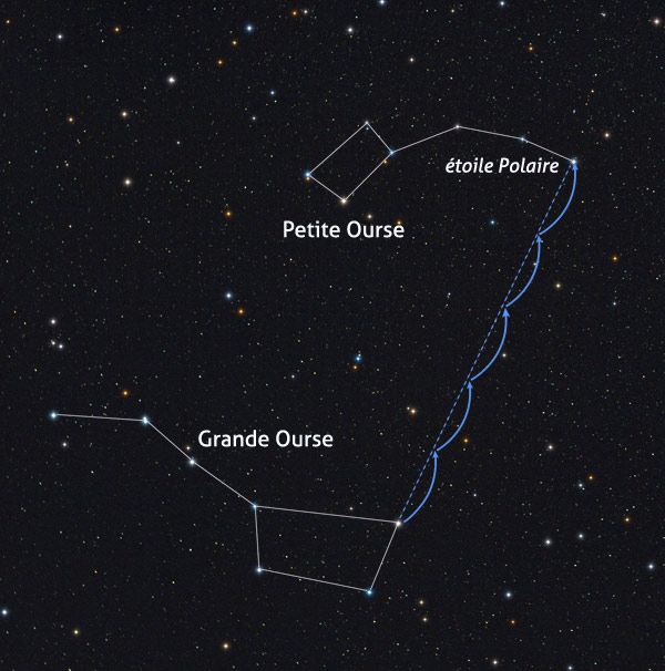 Starting with the Big Dipper, composed of seven magnificent and very visible stars, let's take the two opposite the handle of the Saucepan. They are named Merak and Dhube. A little tip: if you stretch out your arm, spreading your thumb and index finger apart, your two fingers will appear to rest on these two stars. Extend this distance five times toward the top of the Saucepan. We find a somewhat isolated star. It's the North Star, Polaris.