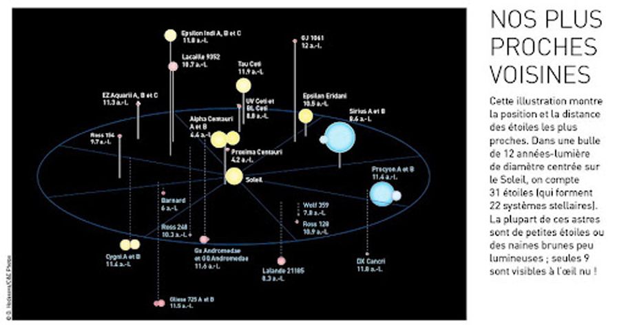 Pour mémoire, notre Soleil se trouve à 150 millions de km, ce qui représente seulement 8 minutes 23 seconde en temps lumière.