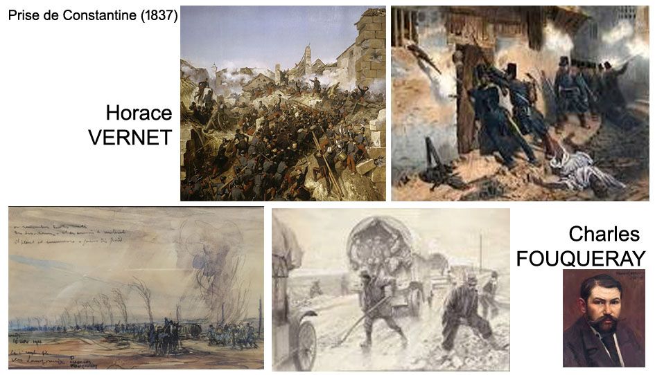 Si la Légion n’est pas encore représentée comme un sujet autonome, elle apparaît déjà dans les grandes compositions des peintres voyageant avec l’armée, notamment Horace Vernet, dont les scènes de batailles et de colonnes en marche posent les bases visuelles des premiers légionnaires au sein de l'armée d’Afrique : uniformes rudes, soleil écrasant, marches interminables, scènes de bivouac et notamment la prise de Constantine (1837).