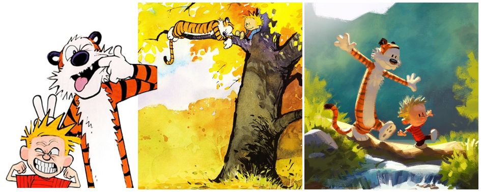To continue, I would like to introduce you—for some of you—and above all remain faithful to the guiding thread explained above: “Calvin and Hobbes,” a reference, a cult figure in the history of comics.