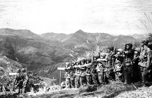 In this review of the legionnaires' skies, how can we not mention the sky at the supreme moment of leaving the world of the living to reach, according to the traditional phrase, the final bivouac? It is the last refuge for a final thought, a final communion, a final prayer. After the fury of battle, far from his birthplace, a distant land will receive his remains: mud for a burial ground and the sky for a tombstone. Our veterans of the RMLE in the trenches, our heroes of Indochina on the hills of Dien Bien Phu.