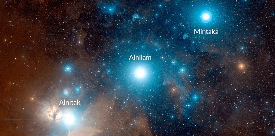 At the center of the constellation, above the nebula, are three stars named Alnitak, Alnilam, and Mintaka, nicknamed the "Three Wise Men." They form what is known as Orion's Belt.